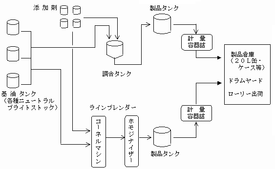 製品タンクに移送された潤滑油は、出荷のため品質検査を受けた後、計量器を経て容器に充填されます。容器は200Lドラム、20Lペール缶、18L角缶、4L缶、1L缶など、各種あります。ポリ容器製品もありますが、環境保護の点から回収する事が要請されています。 需要家の工場などのタンクへ直接納入する場合は、タンクローリーによって納入されます。 図2には基油から容器詰めまでの概略工程を示しました。 ![]() 図2 潤滑油ブレンド工程の一例 |