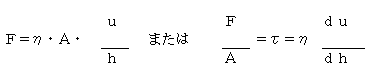Aはすべりの面積、Fはその面に加わる力、F/Α=τはせん断応力であります。u/hおよびdu/dhはせん断速度またはずり速度と呼ばれています。ηは定数であるが、一般にηのことを粘性係数または粘度と言っています。 潤滑油の多くはニュートン流体ですが、潤滑グリース、塗料、印刷インク、コロイド溶液などは上式にしたがいません。このような流体をニュートンの流動法則にしたがわないという意味で非ニュートン流体と呼んでいます。非ニュートン流体には、塑性流体あるいはビンガム流体(図2−b)、擬塑性流体(図2−c)、ダイラタンシー流体(図2−d)といったものがあります。 |