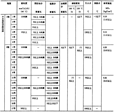 | 備考 | 不揮発分・塩素及び全硫黄分は原液で、それ以外は室温20〜30℃においてW1種は標準希釈倍率10倍の水溶液、W2種は30倍の水溶液の性状を規定したものである。 希釈方法は、6.2による |