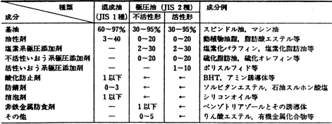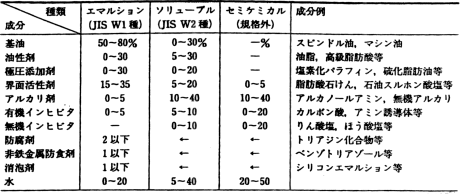 W1種(いわゆるエマルション)は、本来水に溶けない不水溶性油剤の成分を界面活性剤で水に分散するようにし、さらに、さび止め性や耐腐敗性を付与するための成分が添加されたものです。希釈液の外観は牛乳のような白色になります。1〜3号の細分はpH・塩素分・金属腐食によるものです。水溶性切削油の中ではエマルションは潤滑性が優れており、主に切削加工に使用されます。 W2種(いわゆるソリューブル)は希釈液外観が透明もしくは半透明になるものです。合成潤滑油を基油としたシンセティックタイプと呼ばれる油剤は、JISではW2種に分類されます。エマルション、ソリューブルには極圧添加剤を含有したものもあります。またJISの規格外で、セミケミカルという油剤があります。これは無機塩・さび止め剤・アルカノールアミンが主成分であり錆止め性が良好で、主として研削加工に使用されます。 3.配合処方 不水溶性切削油剤の一般的な組成を表3に、水溶性切削油剤を表4に示します。 ![]() ![]() |