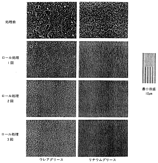 ●グリースの製造方法 クリーン環境用グリースの製造は次の点に留意して行なわれている。 (1)作業環境の清浄化と密閉化 (2)異物混入の防止と混入異物の除去 (3)摩耗の生じにくい機器、配管の使用 (4)洗浄の容易なラインを組む 作業環境を清浄に保つ方法として、エアーシャワールームの設置、無塵衣の着用、室内作業者数の制限、室内空気の浄化などが行なわれている。作業環境の清浄性については、著者らが空気中微粒子自動計測器を用いて行い、クリーン環境用プラントの方が一般工業用プラントに比較し、1μm未満の微粒子の数で極端な差がでると報告している。また、製造工程は図1に示すように、一般工業用グリースと比較し、基本的に大差ない。塵あいなどの異物の混入防止、増ちょう剤粒子の分散、混入異物の除去などの観点から均質化工程(ロール処理)、ろ過・充填工程などが特に重要である。 ![]() 図1 クリーン環境用グリースの製造工程の一例 塵あいなどの異物の混入は耐久性、低騒音性に悪影響を及ぼすので特に注意を要する。異物の大きさが10μm以上となるとごみ音として検出されるので、原料中の異物の除去のみならず増ちょう剤を主体とする大きな粒子、基油に溶解しにくい添加剤の粒子などを上手に分散することも必要である。図2にHDD用グリースのロール処理前後の顕微鏡写真の一例を示す。 ![]() 図2 グリースのロール回数と粒子 ウレアグリースは粒子の分散がしにくいのが特徴である。また、図3、表1にリチウムグリースのロール回数とちょう度、トルクの関係を示す。ロール回数の増加とともにちょう度はやや軟化し、トルクはやや減少している。 ![]() 図3 ロール回数とちょう度、トルクの関係