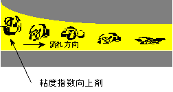 高温高せん断粘度とは エンジン油の高温高せん断粘度(HTHS粘度:High Temperature High Shear Viscosity)を測定する粘度計として、日本ではTBS粘度計という装置が広く使用されているために、150℃、106/sという条件の高温高せん断粘度をTBS粘度と呼ぶことがあります。 先ず、高温高せん断粘度についてご説明する前に、マルチグレードエンジン油の性質について述べたいと思います。マルチグレードエンジン油には、粘度指数を向上させるために粘度指数向上剤というポリマーが添加されています。このポリマーは基油のなかで緩くからんだ糸くずのような形で溶解して粘度を高めています。温度が高くなると基油粘度は低下しますが、「糸くず」が膨らんで流動抵抗を増し、製品の粘度低下を小さくしています。ところが、オイルが金属間の狭い隙間でせん断を受けるとポリマーは流れの方向に配向して(狭い隙間に流れ込む「糸くず」を想像してください。繊維が流れの方向に流れて細長くなり)オイルの粘度低下がおこります。せん断が過酷な場合は、ポリマー分子が破壊されて永久的な粘度の低下を起こします。また、狭い隙間で高速でオイルが流れると発熱し、これも粘度低下の一因となります。 |
