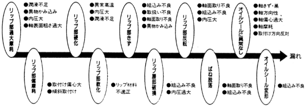 オイルシールの漏れについて オイルシールからの漏れが発見された場合には、まず漏れの発生箇所を十分確認する必要があります。漏れがオイルシールからではなかったり、漏れ以外の付着油脂などを、オイルシールからの漏れと誤認してしまうことが散見されます。 オイルシールからの漏れは、図1に示すようにシールリップ部からの漏れ、はめあい部からの漏れに分けられます。それぞれの漏れ原因の代表的なものを、要因図(図2、図3)に示します。 |