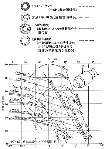 ●軸受の選択 負荷能力による軸受の選択の目安を図5に示しました6)。各種すべり軸受の場合、軸受幅を軸径と同じ(L/D=1)と仮定し油は中粘度の鉱油としてあります。ドライベアリング、含油軸受、ころがり軸受は10,000時間寿命に対するものです。多くの場合、軸受の選択においては負荷能力以外に環境条件、周辺の温度や振動なども合わせて総合的に判断していく必要があります。 ![]() 図5 負荷能力による軸受の選択 以上で述べたように、すべり軸受の使われ方は千差万別であり、すべり軸受の使用に際して、すべり軸受は、常に流体潤滑が確保されることを目標とするのが第一です。ただし、実用上の制約から、境界潤滑や乾燥摩擦で、使用しなければならない軸受けがあることも事実です。 |