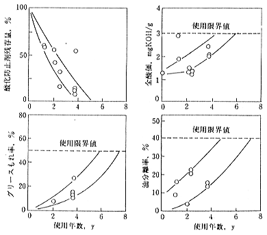 この値を使って、実際の軸受に使用した封入グリースから採取した試料からグリースの劣化度を測定し、グリースの残存寿命を推定することができます。すなわち、図3に示すような使用経過のグリースが、劣化限界値に達するまでの時間を推定すると、5〜7年の寿命になります。この寿命推定値は、ワイトレンジ・グリースの寿命推定式(2)を用いて予測した値の6.88年に近いです2)。 ![]() 図3 グリース残存寿命の推定法 図3の例は、密封玉軸受6202にワイドレンジ・グリースを封入し、150Wのモーターに組込んで、60℃、1500rpmで回転させたものです。 | |||||||||||||||||||||||||||