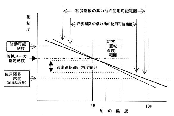 一つの機械の潤滑油を選択するにあたり、配慮すべき必要な項目として、その機械の特性にあった油種の選択と適正な粘度、さらには使用される温度条件の配慮などが上げられます。機械メーカーが推奨する動粘度を基に、最も寒い時の始動可能温度や、もし閉鎖された部屋で運転される場合にはその最高温度、さらには万一トラブルで潤滑油の温度が上昇した場合の安全マージンの取り方、など幾つか考えられます。 これらを配慮するにあたり、必要なのが使用しようとする潤滑油の粘度温度特性であり、「粘度−温度 線図」です。 「粘度−温度 線図」は通常ASTMの定めた表が使用されます。(図1参照) |