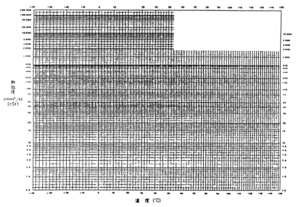 | この表は縦軸に「動粘度」を《対数の対数》で目盛り、横軸は「温度」を《対数》で目盛ってあります。石油製品は多くの炭化水素の混合物であり、未だ理論的には完全に検証されてはいませんが、次に示す“Waltherの実験式”が一般的です。 |