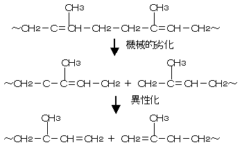 潤滑用語集(日本潤滑学会編集)にて調べてみると次のように説明されています。 「固体物質に加えた機械的エネルギー、例えば衝撃、摩砕、圧延、引張り、加圧などによって固体表面が物理化学的性質の変化をきたし、その周辺に存在する気相、液相または固相に化学変化をもたらすか、またはそれらの各相と固体表面との界面で直接両者間の化学変化を誘起したり、あるいは促進するなど化学的に影響を及ぼす現象を言う。」 もう少し具体的に固体表面の観点から説明すると以下のようになります。 実際の固体面は、清浄面の上にコンタミネーションと言われるさまざまな被膜(酸化被膜)が付着しています。このような色々なコンタミネーションが付着している固体の表面は、清浄面に比べると当然ながら活性に富んでいません。つまり清浄でない一般の表面は、清浄面に比べると化学的にも安定な状態にあると考えられます。色々なコンタミネーションに覆われた固体面に前述のような衝撃・摩砕・圧延・引張り・加圧といったような機械的操作を加えると、コンタミネーションが剥離して、固体の清浄面(新生面)が露出します。 この新生面は、それ自体非常に活性に富んでいますが、このようなプロセスにおいて、固体の表面あるいは固体の内部における結晶格子の欠陥や歪などを増加させます。その結果固体の表面は化学的に活性を増し、化学的変質を生じます。 これがいわゆるメカノケミストリと言われる現象です。 例えば、応力腐食割れという現象は主に合金で発生する現象ですが、外部から加えられた応力や、溶接、冷間加工などに基づく残留応力や熱応力などにより、本来亀裂を生じないような低い応力でも腐食性雰囲気と応力の相乗効果により亀裂を発生し、最終的に破壊に至る現象です。金属表面に応力が繰り返し作用することにより、表面は微視的な塑性変形をおこし、すべりを生じます。このすべり部分が化学的に活性化し、表面近傍に存在する腐食性物質と反応して微細な腐食孔を生成し、集合接続して割れに成長するという機構です。 また、天然ゴムに伸縮を加えると図のような反応が起こります。 |