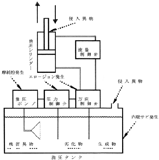発生は作動油あるいはそこに配合されている添加剤の劣化物、摩耗粉やサビなどがあります。これらを図1に示しました。