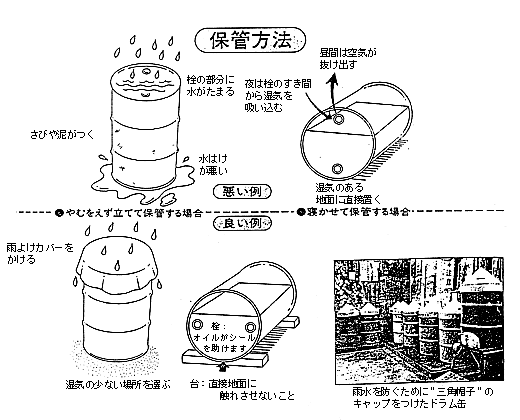 ![]() 【図−1】屋外でのドラム缶の保管方法 参考資料;潤滑油協会編「潤滑管理技術研修会入門講座」 |