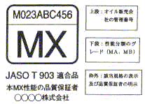 注(1) 試験方法は、ディーゼルインジェクタ法を用い、標準試験条件(30サイクル)で行う。 ◇4サイクル油規格利用システム運用の概要 システム運用の考え方については、4サイクル油の製造会社や販売会社が自主的に、定められた性能試験を行い、該当するグレードを自らの判断と責任において所定の様式に従い容器表示を行うというものです(自己認証制度)。 このJASO規格を適正に運用し、国内外に広く普及させるとともに、将来は国際規格(ISO)への採用を働きかけることを目的に、二輪車用4サイクルガソリンエンジン及びエンジン油に関連する業界団体や学会等が協力して、「JASOエンジン油規格普及促進協議会」(旧:「JASO 2サイクル油規格普及促進協議会」)が設立されております。同協議会は、石油連盟、(社)日本自動車工業会、(社)自動車技術会、(社)日本陸用内燃機関協会、(社)潤滑油協会、(社)日本舟艇工業会の6団体と、その他の関連企業(添加剤会社4社)で構成されています。 同協議会では、関係者に対して協議会が別に定める「JASO二輪車用4サイクル油規格利用ガイドライン」及び「二輪自動車−4サイクルガソリンエンジン油性能分類(JASO T 903)の規格利用マニュアル」に従い、JASO規格の適正利用を働きかけることになりました。 なお、同協議会ではJASO二輪車用4サイクル油規格を利用される4サイクルエンジン油の販売会社が、オイル缶等にグレードを表示する場合は、同協議会に性能試験結果、表示内容等を届出ていただくよう協力を求め、これらを整理保管(オンファイル)し、JASO規格の適正な普及を図るための基礎資料として活用することになりました。また、ユーザーの混乱を避けるため、グレード表示の様式を定め、これに従って表示するように働きかけることになりました。 グレード表示の様式は、図1に示すとおりです。 ![]() 図1 表示様式例 届出の受付、オンファイル業務につきましては、同協議会から委託を受けて、(社)潤滑油協会が実施しております。 今後、このJASO二輪車用4サイクル油規格は4サイクル油の品質、性能を確保し、また消費者が4サイクル油を購入する際の選択基準を明確にするという当初の目的を果たしつつ、将来の国際規格(ISO)への展開等もその目的のひとつとし、国際的に広く普及していくものと期待されます。 (届出の受付、オンファイル等の問合せ先) 〒273−0015千葉県船橋市日の出2−16−1 (社)潤滑油協会・事業部 TEL 047−433−5181 参考文献 | ||||||||||||||||||||||||||||||||||