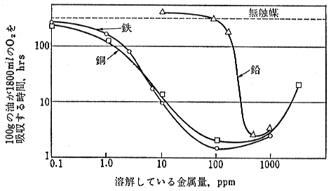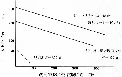 潤滑油は長期の使用中に高温にさらされたり、空気や混入した水分と攪拌され徐々に劣化してゆきます。 さらに、軸受や摺動部分では金属との接触のほか可動部分から発生する摩耗粉の一部が、油中に溶解して触媒となっていっそう潤滑油の劣化を早めます。(金属単体でも触媒効果があるとも考えられています。) 金属の表面に薄い皮膜を作り、潤滑油分子(炭化水素)と金属とが直接接触しないようにすれば金属の影響を和らげることができます。 あるいは、潤滑油中に溶け出した金属と反応させ、不活性な金属化合物とすれば同様に触媒作用を抑えることができます。 このような作用によって、間接的に潤滑油の酸化劣化を遅らせ、寿命を延ばすことが可能となります。 こうした目的で添加する添加剤を、金属不活性剤と呼びます。 図1は、鉄と銅などの金属の触媒としての影響度を示したものです。 ![]() 図1 鉱物油の酸化に対する金属触媒の影響 金属不活性剤のこの作用は逆に言えば、劣化した潤滑油から発生した有機酸や外来の腐食性の物質から金属表面を保護し、腐食を防ぐ役目を果たすことにもなります。このため、金属不活性剤は腐食防止剤として分類されることもあります。 金属不活性剤には、溶解金属(金属イオン)と反応して不活性な物質(キレート化合物)を作るタイプのものと、金属表面に付着し保護皮膜を生成するタイプのものがあります。 代表的なものとして、前者ではチオカルバメート類やサルチル酸系が、後者ではベンゾトリアゾール(BTA)やイミダゾール、チアジアゾール系などがありますが、これら後者の方が工業用潤滑油添加剤として広く使用されているようです。 BTAは油に難溶性のため、最近は溶解性を高めたBTA誘導体も多く使用されています。 図2はベンゾトリアゾール(BTA)をタービン油に添加した場合の効果について表した図です。 ![]() 図2 タービン基油に酸化防止剤、 BTAと酸化防止剤を添加した場合の効果比較例 |