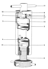 | ASTM D 1404に規定されている方法で、2枚のアクリル板にグリースをはさみ、圧力をかけて30°回すことによりアクリル板に生じるきずの数を測定します。 右に示す試験装置にアクリル板を装着し、グリースをつけます。装置を組立てアクリル板に1.38 MPa の圧力をかけた状態で、一方のアクリル板を30°回します。2枚のアクリル板に生じたきずを計数します。 1.38MPaの圧力でアクリル板にきずをつける粒子が対象になります。二硫化モリブデンなどの固体潤滑剤を含有するグリースなどでは、顕微鏡を用いるきょう雑物として測定出来ないため、この方法が用いられる場合があります。 | ![]() ![]() ![]() | ||||