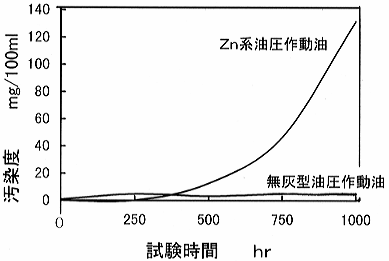 耐摩耗性剤として使用する、りん酸エステルは高温 高荷重にあるしゅう動面が境界潤滑状態にある時、金属面と反応してりん酸皮膜を形成して金属同士の凝着を防止し、焼付き防止、摩耗防止の作用を発揮します。 また、酸化防止剤にはフェノール系のDBPC(ジブチルパラクレゾール)と耐熱性の高いアミン系がバランスよく配合され、その相乗効果をあげています。 図1には、無灰型作動油とZn系作動油のTOSTによるスラッジの生成量の違いを示しました。 また、実際の使用に当っては両者を混合使用しないことと、管理する場合には全酸価の初期値が異なりますので留意する必要があります。