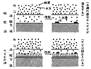 吸着層の性質は表面の粗滑表面物質の種類(酸化物、水酸化物、水和生成物など)とその均一性、化学吸着している分子間のVan der Waals力の大きさによってきまってきます。Van der Waals力は吸着エネルギーに大きく寄与していることが分かっているので、これが大きい場合、つまり分子が長ければ吸着力も大となります。このためサビ止め添加剤は分子量が大きい方が良いとされていますが、あまり大きすぎると油への溶解度が小さくなるので分子量にも限界があり、スルホン酸では300〜470が良いといわれています。 サビ止め油は添加剤の他は大部分が基油の炭化水素分子からなりたっております。基油は次のようにサビ止め作用上かなり重要な働きをしています。