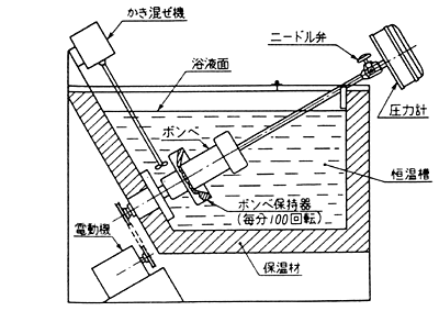 | (2) | ボンベを30度の角度に保持しながら毎分100回転で回転させます。圧力が最高になったときから175kPa(1.8 kgf/cm2)下がるまでの時間を測定します。 |