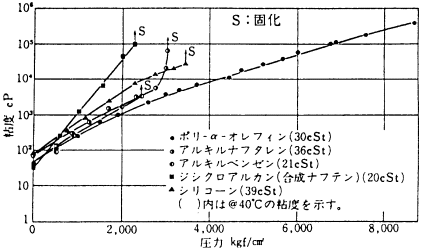 ![]() 図2 合成潤滑油の高圧粘度特性(@27℃) | |