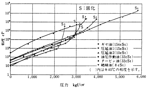 工業用潤滑油においては、ギヤ油およびナフテン系の絶縁油がやや高い粘度の圧力係数αを示します。また圧延油1、2が比較的低圧力下(2,000〜3,000kgf/cm2)で固化しはじめます。 | |