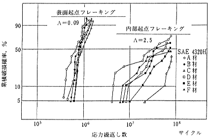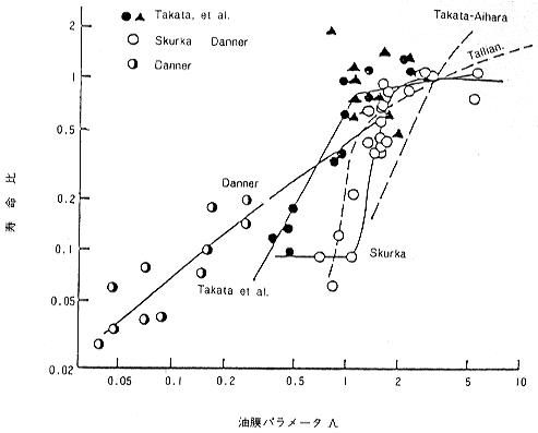 IS-S45 転がり軸受の寿命についてどんなことが明らかになってきたのか 機械や機械要素の中で、転がり軸受のように、形状、寸法から寿命の計算法に至るまで、国際的に標準化されている商品は、他にないとされています。 その中で、最近、転がり軸受の寿命について、色々な研究が行なわれ、今まで判らなかったことが、次々に明らかにされています。 ●軸受の寿命には2つの種類がある −転がり疲れ寿命と機能寿命− 転がり軸受が使えなくなるという意味での寿命には、2つの種類があります。 第1は、転がり接触面で繰り返されるHertzの弾性接触応力によって、材料が疲れ破壊をおこすことです。これは、軸受が転がり運動を利用するからには、本質的に防ぐことのできない寿命で、“転がり疲れ寿命”と呼ばれます。 第2は、転がり接触する表面の粗さが、摩耗などによって大きくなり、その結果として、軸心の振れ、音響と振動、摩擦モーメントの増大また焼付きの発生などの現象として現われます。そのため、その軸受を使った機械が本来の機能をはたすことができなくなり、軸受の寿命と判断されます。 その原因は、転がり接触面の潤滑不良であることが多いので、“潤滑寿命”とか“機能寿命”とか呼ばれます。この寿命は、軸受の潤滑剤・潤滑法および密封装置の改良によって、防ぐことができます。 一般に、転がり疲れ寿命は動力伝達を主な使命とする重厚長大の機械で発生し、主に情報を伝達する軽薄短小の機械では、機能寿命が問題になることが多いようです。 ●転がり疲れ寿命にも2つの種類がある −内部起点フレーキングと表面起点フレーキング− 材料の転がり疲れ寿命にも、2つの種類があることが明らかにされています。 1960年代に、転がり軸受に使われる軸受鋼の製鋼法は、大気溶解法から真空脱ガス法に変わり、鋼の中の酸素量が少なくなりました。そして、実験室での試験の結果、真空脱ガス鋼の転がり疲れ寿命は、大気溶解鋼の3倍以上になることが判りました。 事実、モータなどに使われる密封玉軸受の転がり疲れ寿命では、フィールドで3倍以上の寿命の実績が得られました。そして、モータ用玉軸受は重荷重用の63形から中荷重用の62形、さらに軽荷重用の60形にサイズ・ダウンされました。 しかし、自動車や圧延機などのシールまたはシールドを持たないオープン形の軸受では、寿命が延びた実績はフィールドでは得られませんでした。 多くの研究の結果、軸受材料の改良によって転がり疲れ寿命を長くすることができるのは、転がり疲れによる最初のクラックの発生が、転がり接触理論から予測計算され、ISOやJISで軸受寿命と定義されているような、表面下の内部の動的せん断応力が最大になる位置から起こる場合に限られることが判りました。そして、最初のクラックの発生が、表面から起こる場合には、材料の改良の効果は全く現れないことが証明されました。 そして、前者の場合は、転がり接触面の潤滑状態が良好で、転がり接触面に油膜が形成され、接触面で金属同志の直接接触がおこっていないこと、また後者は、転がり接触面の潤滑状態が悪く、油膜が形成されていなかったり、摩耗粉、外部からのごみや水分などが混入して、金属同志の直接接触がおこっている場合であることも判りました。 前者を、“内部起点フレーキング”と呼び、転がり疲れ寿命の予測計算式が適用できます。後者は“表面起点フレーキング”と呼ばれ、従来の寿命計算式では予測ができません。 ●油膜パラメータから転がり疲れ寿命を見ると では、転がり接触面の間に形成される油膜の良否は、どのように表わされるのでしょうか。1960年代から発達した弾性流体潤滑(EHL)理論によって、転がり接触面に形成される油膜の厚さが計算できるようになり、また実験による裏づけも得られました。EHLによる油膜厚さは、軸受荷重の影響をあまり受けず、回転速度による効果が大きいという特長をもっています。 そして、EHLによって形成される油膜厚さhが、転がり接触面の表面粗さσ1とσ2の和より大きいならば、転がり接触面に金属同志の直接接触がおこらないことになります。
