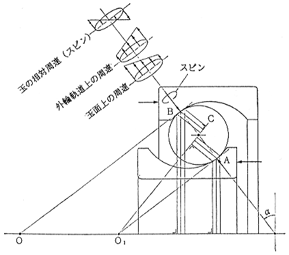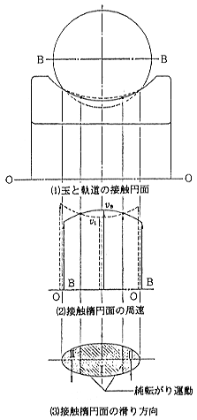 ID-S56 転がり軸受の摩擦はどのような原因で起こるのか 転がり軸受は、ほかのいろいろな軸受と比べて、摩擦が小さいのが特長の1つです。それでは、転がり軸受の摩擦は何故小さいのか、また、どのような原因で摩擦が発生するのか以下に述べます。 滑り摩擦係数の大きさは、いろいろな金属材料について、乾燥摩擦のときにμ=0.3〜0.8程度、油による境界潤滑ではμ=0.1〜0.3程度の値になります。 転がり摩擦は、摩擦による“力”ではなくて“モーメント”の形で現われるので、着力点を決めないと力としての比較ができません。そこで、着力点を玉や円筒の表面に沿った所とすると、転がり接触を使って物体を動かす力は、滑り摩擦力の1/100〜1/1000程度の大きさにすることもできます。 この現象を利用して、動く部分の摩擦による動力損失を小さくしたのが、転がり軸受、ボールねじ、転がり直動案内のような転がり運動を利用した精密機械要素です。 ●転がり摩擦は何が原因でおこるのか 転がり軸受の中で、玉やころは3〜4GPaのように大きな接触面圧で曲率半径が異なる軌道と接触するので、弾性的に変形した後の接触面の形は曲面になるのが普通です。すると、玉やころの転がり運動の際には、この接触曲面の中でミクロな滑り現象がおこり、その結果、滑り摩擦が発生します。 そこで、全く同じ直径の玉同士を接触させると、その弾性接触面は完全な平面になります。この状態で振子による減衰法で転がり摩擦を測定すると、真の転がり摩擦を求めることができます。 その結果、純粋な転がり摩擦は弾性ヒステリシス損失すなわち材料の内部摩擦であることが分りました。そして、その大きさは計算によって求めることができ、玉の場合、荷重の4/3乗に比例して大きくなります1)。 ●深い溝の中を転がる玉の摩擦は 玉軸受の内輪の溝と玉の接触面は図1のように弯曲した曲面になります2)。したがって、玉が転がるときの玉の周速の分布はvB、内輪軌道の周速の分布はv1になります。すると、純粋な転がり運動に必要な、周速が等しいという条件は、vBとv1の交点である接触楕円上の2本の線の上でしか起こらず、その内側Tと外側Uの面の部分では、互に反対方向の滑り運動がおこります。これを玉の差動滑りと呼び、玉の転がり摩擦の主原因になります。その大きさも計算によって求めることができ、荷重の5/3乗に比例して大きくなります3)。 ![]() 図1 玉の差動滑り ●玉のスピン滑り摩擦とは 深溝玉軸受やアンギュラ玉軸受にアキシアル荷重を加えて回転させると、図2のように、内輪または外輪の軌道のどちらかで、回転軸に対して周速が等しくなるという転がり接触の条件を満たすと、反対側の軌道輪の軌道ではこの条件を満たせなくなります。そして、転がり接触のおこる軌道と反対側の軌道では、玉はその負荷軸のまわりに回転しながら転がり運動することになります。この負荷軸のまわりの玉の回転を玉のスピン滑り運動と呼び、それによって滑り摩擦が発生します。この場合、純転がり運動は、スピン滑り摩擦の大きい方の軌道輪の側でおこります。 ![]() 図2 玉のスピン滑り この滑り摩擦の大きさも、計算によって求めることができ、荷重の4/3乗に比例して大きくなります4)。 ●弾性流体潤滑(EHL)油膜の摩擦は 玉軸受でもころ軸受でも、軸受の中の潤滑状態は起動の際には境界潤滑状態ですが、回転を始めるとEHL状態、または荷重の小さい場合には、流体潤滑状態になることもあります。 EHL油膜や流体潤滑油膜による流体の粘性摩擦抵抗の大きさも、複雑ではあるが計算によって求めることができます3,5)。 ●摩擦モーメントの発生原因は 転がり軸受の摩擦モーメントの発生原因には、次に挙げるいろいろのものがあります。