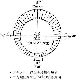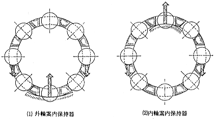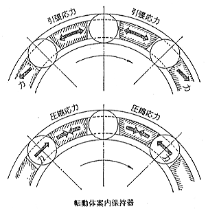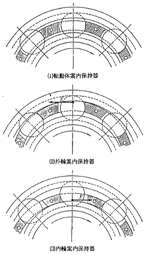 ID-S58 転がり軸受の保持器についてどのようなことが明らかになっているのか もし保持器がないと、転動体(玉またはころ)は隣同士の接触部分で、互に反対方向の滑り接触をするので、2倍の相対滑り速度になります。そのため焼付きや摩耗をおこし易くなります。 保持器の働きの第1は、転動体を互に接触しないように等間隔に分離すること。第2は、転動体が起動輪から脱落しないように保持すること。第3は、転動体の回転の案内をし、駆動することです。 保持器は軸受荷重を直接には負荷しないので、例えばプラスチックスのように、強度がそれほど大きくない材料でも使うことができます。一般には、強度よりも低摩擦、低摩耗、耐焼付きのようなトライボロジ特性の優れたことが要求されます。 ●保持器はすきまの中で自由に動ける 保持器には転動体との間にポケットすきま、起動輪との間に案内すきまをもち、軸受の中で、これらのすきまが許す範囲内で3次元的に自由に動けるように設計されています。 したがって、鉄道車輌の車軸や鉄鋼の圧延機のロールネック軸受のように、大きな衝撃荷重を常時受けるような場合には、保持器は大きな加速度で軌道論または転動体と衝突を繰返します。そのため保持器に衝撃応力が発生し、その繰返しでリベット部分や保持器本体が疲れ破壊をおこすこともあります。 ●ラジアル荷重またはアキシアル荷重だけを受けるときは 保持器には、軌道輪の肩の部分との間の案内すきまの与え方によって、転動体案内、外輪案内、内輪案内の3つの方式があります。 小形軸受では、保持器の内径側と外径側のどちらも内輪、外輪とは接触しないように設計してあるので、保持器は転動体によってのみ回転の駆動と案内を受けます。これを転動体案内保持器と呼びます。 大形軸受では、保持器の外径面を外輪の肩部に接触させるか、保持器の内径面と内輪の肩部との間を積極的に接触させて、保持器の回転の案内を行います。前者が外輪案内、後者が内輪案内の保持器です。 軸受の普通の使い方である内輪回転で外輪静止の場合、転動体案内の保持器では、図1のように1)、保持器はポケット面の回転方向の側で、軸受の負荷帯の中にある転動体と滑り接触します。そして、その転動体から駆動力を受けて回転します。外輪案内の保持器でも、同様に負荷帯の中にある転動体から、回転のための駆動力を保持器ポケットの回転方向の側で受けて回転します。しかし、保持器は外輪案内面で発生する滑り摩擦力によって、回転に対するブレーキの作用を受けます。 ![]() 図1 保持器の案内形式と駆動・制動 これに対して、内輪案内の保持器では、内輪案内面と保持器との接触面において、内輪案内面の周速は転動体の公転速度で決まる保持器案内面の周速より常に大きくなります。したがって、保持器は内輪案内面において、その滑り摩擦力によって回転に対する駆動を受けます。そのため、負荷帯の中の転動体は保持器ポケットの回転方向と反対側で接触しながら、保持器の回転速度を制動し、規正します。 軸受の負荷帯の中で、転動体が保持器ポケット面と接触する部分に働く回転方向の力は、保持器の案内面に作用する上述の滑り摩擦力によるモーメントと釣合う大きさの力になります。したがって、これらの力の大きさは保持器の強度にとって問題になるほど大きくならないのが普通です2)。 ●内輪と外輪が互に傾けられて使われると 軸受がラジアル荷重とアキシアル荷重の合成荷重やモーメント荷重を受ける場合、また軸とハウジングの軸受を取付ける部分の精度が悪くて取付誤差がある場合には、内輪と外輪が互に傾けられながら使われます。このとき、ころ軸受では、ころにスキューなど不具合な運動がおこります。玉軸受では、軸受の中のどの位置でも玉の接触角が互に異る値をもつようになります。そして、玉の公転速度は接触角によって変ることになります。 いま、外輪が取付誤差によって傾けられた状態でアキシアル荷重を受ける玉軸受の例を示します。図2のように、外輪を矢印の方向に傾けると、αmax−1および−2の位置で玉の接触角は極大値を示し、αmax−1の位置で玉の接触荷重は最大になります。 ![]() 図2 外輪の傾きによる玉の荷重分布 玉の中心の公転速度vBは、図3に示すように3)、接触角αとともに変化するのに対し、保持器ポケット面は一定速度vCで公転します。そして、時間の経過に対して玉の進む距離lBは曲線状になるのに対して、保持器ポケットの進む距離lCは直線になります。玉の保持器ポケット面に対する遅れと進みを示す(lB−lC)の値が、ポケットすきまCより大きくなる位置で、玉と保持器ポケット面が接触し干渉をおこします。そして、玉がポケット面を押す力FB-Cとポケット面が玉を押す力FC-Bが発生し、保持器の回転毎に繰返されます。 ![]() 図3 玉と保持器ポケット面の接触位置 興味のあることは、玉−保持器との間に発生する力は玉と保持器の速度の差で
