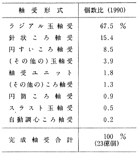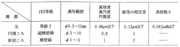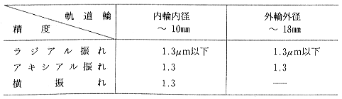 ID-S64 ベアリングはどこまで使えるようになっているのか 転がり軸受、ボールねじ、転がり直動案内などベアリングは、いまどこまで使うことができるようになっているのでしょうか。 形式、大きさ、機能、運転条件など、ベアリングの一番についての話を述べましょう。 ●一番多く使われる転がり軸受の形式は 転がり軸受には、いろいろの形式の軸受があります。日本で生産されている軸受の数を調べると表1のようになります。すなわち、数の上ではラジアル玉軸受、針状ころ軸受、円すいころ軸受の3つの形式で全体の約90%を占めます。その他の形式の軸受は、それぞれ数%の程度です。 ![]() そして、ラジアル玉軸受の80%以上は深溝玉軸受です。1個の軸受でラジアル荷重と両方向のアキシアル荷重を受けることができ、しかも標準の内径、外径、幅の寸法で、予め潤滑グリースを封入した密封玉軸受があることが、この形式を一層使い易いものにしています。その上、後述のように、一番精度の高い軸受があるのもラジアル玉軸受です。 ●一番小さい寸法のベアリングは ・転がり軸受の形式ごとに、一番小さい主要寸法を表2に示しました。一番小さい寸法をもつ軸受形式は、深溝玉軸受の内径1mm×外径3mm×幅1mmです。最近の機械の軽薄短小化のために、ミニアチュア玉軸受の需要が増えています。 ![]() ・ボールねじでは、ねじ軸の直径2mm、ねじ軸の1回転でナットの進む距離を示すリード1mm、そのナット外径6.5mmが一番小さいものです。 ・リニア・ボールベアリングで一番小さいのは、内接円径3mm×外径7mm×幅10mmです。 ・リニア・ガイドでは、レール高さ5.5mm×幅9mmでベアリング組立て高さ6.5mm×幅15mmのものがあります。 ・転動体で一番小さいものを表3に示した。一番小さいのは玉直径0.3mmである。仁丹の銀玉の直径が2.5mmであるのに比べて、如何に小さいかがわかります。 ●一番大きい寸法のベアリングは ・転がり軸受では、旋回輪軸受と呼ばれる玉軸受で外径5.7m、重量17t、原子炉“もんじゅ”の遮蔽プラグに使われています。海外の軸受メーカのカタログには、一体形で外径8m、軌道輪を分割して製造し、組立てた外径15mの転がり軸受の例があります。 ・ボールねじでは、ねじ軸外径300mm×長さ16m、ナット外径420mmがあります。その重量は11トンもあり、製鉄所の高炉に使われています。 ・リニア・ガイドではベアリングの組立て高さ150mm×幅290mmがある。レールは継いで使うことができるので、いくらでも長くすることができます。 ・転動体で一番大きいものを表3に示した。直径114mmの玉が一番大きいです。 ![]() ●一番精度の良いベアリングは ・転がり軸受の中で一番高い回転精度をもつのはラジアル玉軸受です。アメリカ軸受製造業協会AFBMA規格の計器用精密軸受Class 9Pが一番高い精度です。この規格に従った軸受は日本でも製られています。それは表4のように軌道輪の振れ精度が1.3μm以下です。玉軸受で支えられたスピンドルの軸心の振れは、0.2μm以下にできます。 (ABEC規格−9P級) ![]() ・動圧グループ軸受や静圧空気軸受を使ったスピンドルの軸心の振れは0.05μm以下にすることができます。 ・ボールねじの動的精度は、ねじ軸1回転に対してナットが軸方向に進む距離を示すリードの変動誤差(よろめき)で表されます。一番高いリード精度はCO級で、ねじ部の有効長さ内で任意に選んだ300mmに対して、リードの変動は3.5μm以下、ねじ軸の1回転内で任意の回転角に対応するリードの変動は2.5μm以下です。 ・リニア・ガイドでは、動的精度はレールに組合わされたベアリング移動テーブルをレール長手方向に移動させたときの、レール基準面に対する移動テーブルの変動で表わされる。この走り平行度の一番高い精度はP3級で、レール全長800mmで2μm以内、3150mmで6μm以内です。 ・転動体の一番高い精度を表5に示しました。一番高い精度は玉の等級3で、直径0.3〜12mmについて真球度0.08μm以下、直径の相互差0.13μm以下、表面粗さ0.012μmRa以下です。 ![]() ●一番高速で使われているベアリングは ・転がり軸受の高速回転については、回転角速度の大きい軸受と周速の大きい軸受の2つの考え方があります。 回転角速度の大きな軸受としては、内径3.175mm×外径6.350mm×幅2.380mmの歯科用スピンドルの深溝玉軸受が50×104rpmで使われています。 高周速の軸受としては、航空ジェットエンジンの主軸受に使われる玉軸受と円筒ころ軸受がdn値2.2×106で実用化され、dn値3×106が実験室で実現しています。ここでd:軸受内径mm、n:軸受回転速度rpmです。この主軸受の軸受内径は120〜250mmなので、dn値3×106は内径面周速で160m/s程度になります。 転がり軸受の高速回転限界は、軸受材料の遠心力による破壊によって決まります。 ・ボールねじでは、ナットの送り速度はねじ軸の回転速度とリードの積で決まり、NC工作機械では24m/min、パンチプレスやロボットでは90m/minで使われています。ボールねじのリードは軸径の2倍の寸法まで製られており、Dmn値は15×104まで使われ