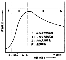 | 通常大気中におかれた金属表面は、II〜IIIの水膜領域にあり、腐食は、急速に進行しやすいことがわかります。また水膜が亜硫酸ガスや汚染質を含んでいる場合さらに加速されます。 |