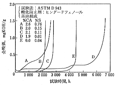 次にある基油に添加した場合にどれだけその性能が発揮できるかという評価が重要になってきます。その理由は、同一の酸化防止剤を等量に添加しても添加する基油の組成、精製度によってその添加効果が大きく異なるからです。元来、溶剤−水素化精製をおこなった基油には天然の酸化防止剤が含まれ、適度な酸化防止作用を発揮します。しかし、これはマイルドな条件下での使用には十分有効ですが高温条件下での長期の使用では逆に劣化時にスラッジを生成するとされています。 このため、近年ではより高度な処理をおこない、この天然酸化防止剤を含め不純物を極力除去した基油も多くなっています。この基油は合成系酸化防止剤の添加効果がより大きくあらわれる特性をもっています。 このような点から、潤滑油メーカー各社が持つ基油と一体となった酸化防止性能を評価の対象としなければ判断を誤ることになります。図1には、数種の基油と同一酸化防止剤の添加効果を示しました。 ![]() パラフィン系基油 CA:基油中のアロマ分 S:基油中の硫黄分 図1 酸化防止性能に及ぼす基油組成の効果 基油との総合的な評価法としては「JIS K 2514:酸化安定度試験」が多く採用されています。 これらの試験法を表1に示しますが、内容についてはここでは省略します。