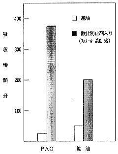 ![]() 図2 ロータリーポンプ試験における酸化防止剤の効果 (4)トラクション係数が低く、省エネルギーが可能。(表2)