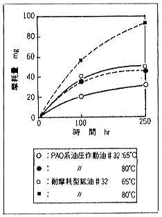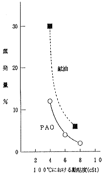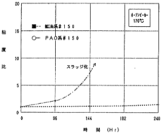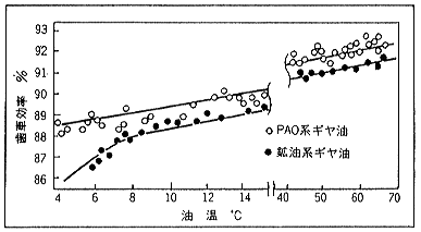 *2 二円筒式摩擦試験機により測定 (5)金属腐食やプラスチックに対する影響が少ない。 (6)分子量分布が狭く、高温における蒸発損失が少ない。 ![]() 図3 蒸発量の比較(204℃×6.5Hr) このような特長を応用して、エンジン油を始め各種潤滑剤が開発されていますが、以下に工業用潤滑油の例を示します。 ●PAO系ギヤ油 PAO系ギヤ油は、従来の鉱油系ギヤ油と比較し、高い粘度指数でかつ低温流動性が良好なこと、およびトラクション係数が低いことから、省エネルギーが期待され、更に、寒冷時における起動トラブルの回避にも有効です。 図4はギヤ油の効率測定結果ですがPAO系ギヤ油は特に低温時で、粘度が低い為、3〜4%の効率の上昇が見られました。 ![]() 図4 PAO系ギヤ油の省エネ性 製鐵所における屋外機器用ギヤ設備は小型タイプが多く、間欠運転が多いことから特に冬場における始動時および効率が問題となります。ある製鐵所においてはこのことから既にPAO系ギヤ油に1000台以上更油し、大きな成果を上げています。 ●PAO系軸受油 PAO系軸受油は、熱酸化安定性を要求される耐熱軸受油として開発されており、従来の鉱油系の2倍以上の寿命を有しています。 図5に例を示しましたが、粘度増加および全酸化増が低く、熱酸化安定性が良好です。 ![]() 図5 熱酸化安度試験における粘度比の変化 このことから、抄紙機などの軸受油として使用され、従来以上の温度領域で寿命延長が可能になりました。 ●PAO系回転式圧縮機油 回転式圧縮機油は潤滑油の中でも最も酸化安定性が要求されています。特に最近においては、装置の小型化、空冷化、吐出圧力の増大などによりその要求はますます大きくなっています。 PAO系回転式圧縮機油の特長は、酸化安定性が良好なだけでなく、スラッジの生成度合が少なく、また水分離性、消泡性(放気性)がよいことが上げられます。 これらのことから、更油期間の延長およびミストセパレータの目詰りによる自動停止などのスラッジによるトラブルの解消が期待できます。 ●PAO系作動油 PAO系作動油は、その基油の特性から高粘度指数で低温流動性がよく、更に鉱油系高粘度指数作動油のように、粘度指数向上剤(ポリマー系)を含まない為に、剪断による粘度低下を起こさず、長期間安定した粘度特性を示します。 また、最近の油圧機器の高圧化および小型化により、作動油の温度が上昇する傾向にあります。油圧機器の信頼性を確保するには作動油中のコンタミレベルを管理するとともにコンタミの効率的な除去と内部発生する摩耗粉やスラッジを発生させないことが重要なポイトとなります。 図6はベーンポンプ試験における温度による影響を比較したものであるが、鉱油系が80℃で摩耗量が増大するのに対し、PAO系ではその割合が少なくなっているのがわかります。 ![]() 図6 ベーンポンプ耐摩耗テスト結果 ある製鉄所においては、油圧モータで走行するキャリアパレットにPAO系作動油を使用しており、これにより、故障低減、オーバーホールの周期延長が試みられています。 ●まとめ PAOは、自動車用高級エンジン油として多く利用されていますが、工業用としてはイニシャルコストが鉱油に比較して高いことから普及は少なく、現状では従来の鉱油系潤滑油では対応が難しい所への適用(問題解決型)が多いといえます。 しかしながら、PAOの特性(低流動点、高粘度指数、蒸発特性、低トラクション等)を十分に理解し、積極的に利用すれば、省力化(メインテナンスコストの低減)、省エネルギー化などの効果を発揮し、結果的にトータルコストの削減につながる使用事例が増加しています。 | ||||||||||||||||||||||||||||||||||||||||||||||||||||||