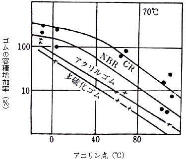 ゴム膨潤性は、潤滑油のアニリン点によって変化します。精製度が高くてアニリン点の高い基油を使ったコンプレッサー油はゴムをあまり膨潤させません。 レシプロコンプレッサー油では、弁へのカーボン堆積を抑制し、除去し易くするためにアニリン点が低目のナフテン系基油を使うメーカーも有り、これには耐油性の高いゴムを選定する必要があります。 ![]() 図1 アニリン点とゴム膨潤性 スクリューコンプレッサー油では精製度の高いアニリン点の高いパラフィン系基油が使われるためゴムを膨潤しませんが、長寿命型のアルキルナフタレン系やポリαオレフィン系コンプレッサー油では鉱油と違った挙動を示す。ポリαオレフィン系ではゴムが収縮するために漏れに注意する必要があり、エステル系やアルキルナフタレン系では膨潤の少ないゴム材料を選ぶ必要があります。 ゴム材料に対するコンプレッサー油基材の膨潤性を表1に示します。 |