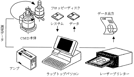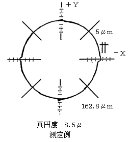 真円度はX軸、Y軸をX2+Y2=R2のとおり動かして半径Rの円を描かせ、その円からの「ずれ」を測定します。 測定法概要および測定例は次のようになります。摺動面油は真円よりの「ずれ」が少なくなるようにデザインされています。 ![]() 図2 真円度計の構成
