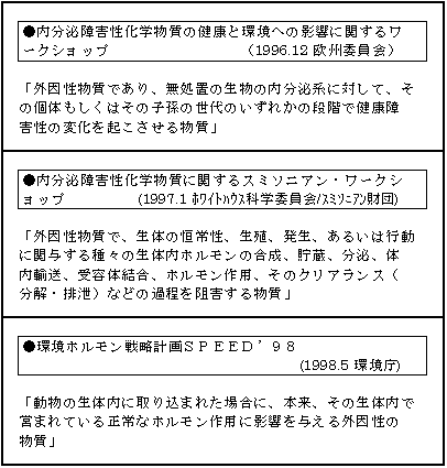 「環境ホルモン」という名称は、そもそも日本で主に使われている名前です。 正式な名称は「外因性内分泌かく乱化学物質」。身体の外にある物質が原因で、ホルモンすなはち内分泌が、かく乱するという意味です。 海外では、 「Endocrine Disruptors」 (エンドクリン・ディスラプターズ=内分泌かく乱物質) 「Endocrine Disrupting Chemicals」 (エンドクリン・ディスラプティング・ケミカルズ=内分泌かく乱化学物質) と呼ぶのが一般的です。 そもそも環境ホルモンとは、一つの化学物質をさしてるわけではありません。 これは、ホルモンの働きをかく乱すると言われる化学物質の総称です。 これらの化学物質には、さまざま定義がなされています。 ![]() 「環境ホルモン」をめぐる一連の流れ(化学物質をめぐる動き・規制への動き・化学物質の汚染の状況)を下記に示します。