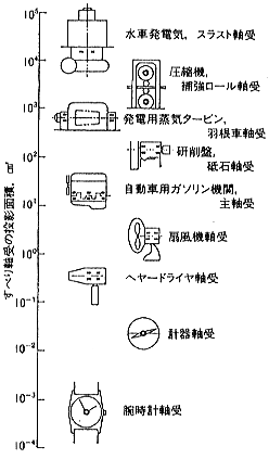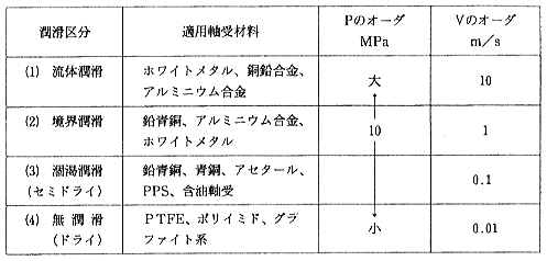 ●軸受の選択 負荷能力による軸受の選択の目安を図5に示しました6)。各種すべり軸受の場合、軸受幅を軸径と同じ(L/D=1)と仮定し油は中粘度の鉱油としてあります。ドライベアリング、含油軸受、ころがり軸受は10,000時間寿命に対するものです。多くの場合、軸受の選択においては負荷能力以外に環境条件、周辺の温度や振動なども合わせて総合的に判断していく必要があります。 ![]() 図5 負荷能力による軸受の選択 以上で述べたように、すべり軸受の使われ方は千差万別であり、すべり軸受の使用に際して、すべり軸受は、常に流体潤滑が確保されることを目標とするのが第一です。ただし、実用上の制約から、境界潤滑や乾燥摩擦で、使用しなければならない軸受けがあることも事実です。 |
