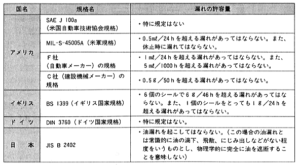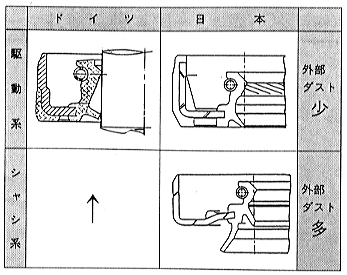 ID-S66 海外におけるオイルシールの技術動向について 1.オイルシールの規格 オイルシールは主要ユーザーである自動車産業の活発な欧米、日本で改良・開発が盛んに行われています。その規格は、アメリカではSAE、ドイツではDIN規格などで、日本ではJIS B 2402で定められているが(表1)、一般に使用されるオイルシールは使用条件や取付方法などにより数多くあり、それぞれの規格では標準形状、標準条件を定める程度となっています。 ![]() 密封流体のにじみ出し程度の漏れは許容している規格が多いが、近年の信頼性向上のニーズからも実際上は漏れが許容されることはほとんどありません。 2.海外の技術動向 (1)欧州 欧州におけるオイルシールは、発祥の地ドイツを中心に研究・開発が活発に行われています。アウトバーンに代表される高速道路が発達していることからも、欧州では高速度用オイルシールが主体となっています。 (1)シール形状 駆動系およびシャシ系の代表的なシール形状を見ると(図1)、外部ダストの多少に関わらずダストリップ付シールが大半だが、日本では外部ダストの多いハブなどの使用箇所ではサイドリップ付シールを使うのに対して、ドイツでは、舗装率が高く日本ほど外部ダストの影響を考慮しなくてもよいことから、そうした形状のものはほとんどありません。 ![]() 図1 シール形状比較(日欧) また、リップ形状は高速走行による摺動発熱を抑えられるような低トルク形状が多用されています。この低トルク形状リップは、シール発熱の低減だけでなく寿命延長にも効力を発揮することから、日本でも採用が進んでいます。 (2)シール材料 オイルシール用ゴム材料は以前はニトリルゴムが主体だったが、高速化が早くから進展したことにより、アクリルゴム(ACM)、ふっ素ゴム(FKM)に移行し、近年は特に耐熱性に優れるFKM材が主流となっています。材料の性質として、FKM材に次いで耐熱性のよいシリコンゴム(VMQ)は引張強さ・引裂抵抗が他の材料に比べて小さいため(表2)、シールの軸装着時にリップ傷が付きやすいなどの欠点があり、欧州ではほとんど使われていません。日本では以前、エンジン用オイルシールでVMQ材が多用されていたが、現在では信頼性向上からFKM材が使われることが多いです。 ![]() (2)北米 アメリカでは近年まで、エンジンシールではひも状のジュートシール、バルブシステムではOリングなど様々なシールが使われていたが、日本車との競合から品質面での改善が進んだ結果、オイルシールも日本や欧州と同様の仕様のものが使われはじめています。 (1)シール形状 日欧と大きく異なる形状ではないが、周辺機器を取り込んだユニット化が進んでいる点が特徴的です。シャシ系に使用されるユニタイズドシールの一例を見ると(図2)、スリーブ付とすることにより相手軸の加工コストを低減するとともに、メンテナンスを容易にしています。他にもユニット化によるトータルコストダウンを目的に、エンジンシール、バルブステムシールなど、ユニット化やパッケージ化の検討が活発に行われています。日本でも、リテーナー一体型オイルシール(図3)などで一部、ユニット化が始まっており、今後、活発化すると見られています。
